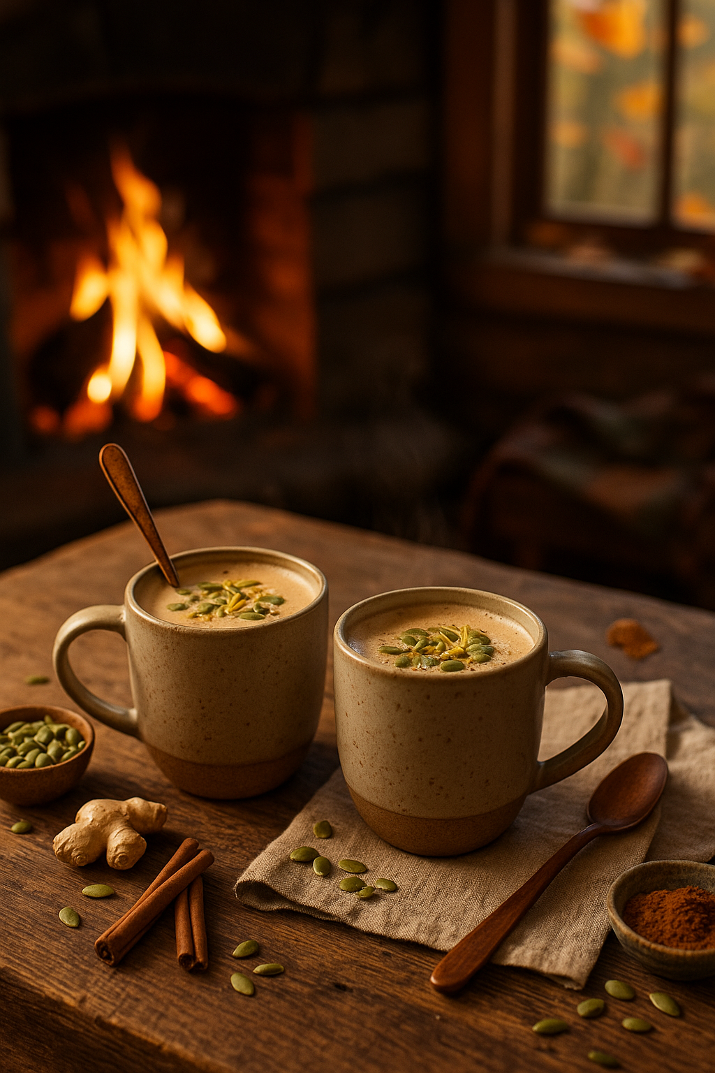 Add pumpkin seeds + warm water to a blender. Blend 45–60 sec until milky. Strain through a fine mesh if you prefer ultra-smooth; otherwise keep whole for extra body.Warm + infuse: