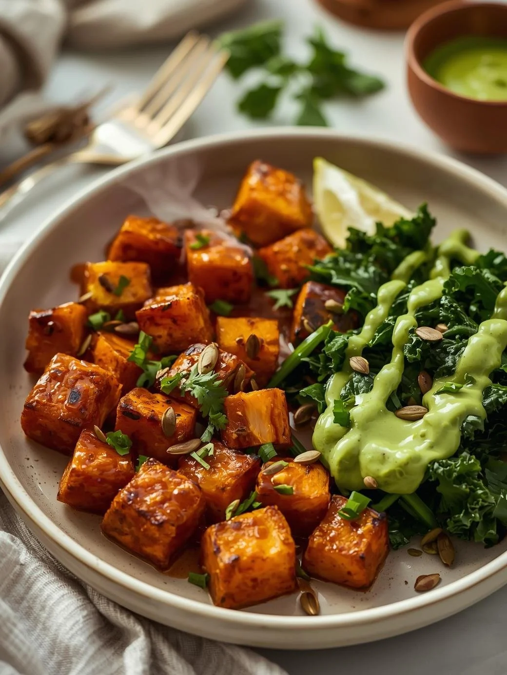 Preheat the oven to 200°C / 400°F. Toss the sweet potato cubes with olive oil, smoked paprika, garlic powder, cumin, salt, and pepper. Spread on a baking tray and roast for 25 minutes, flipping halfway, until tender and caramelized at the edges.