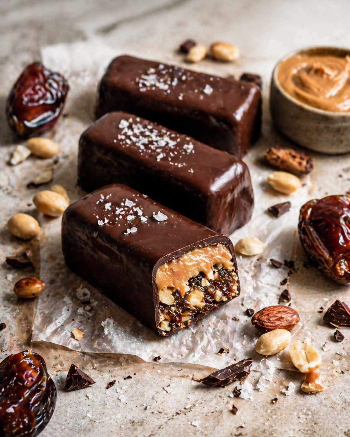 Peanut butter makes the caramel layer creamy and satisfying, while contributing some protein and healthy fats. The original recipe uses natural peanut butter as the main caramel ingredient.