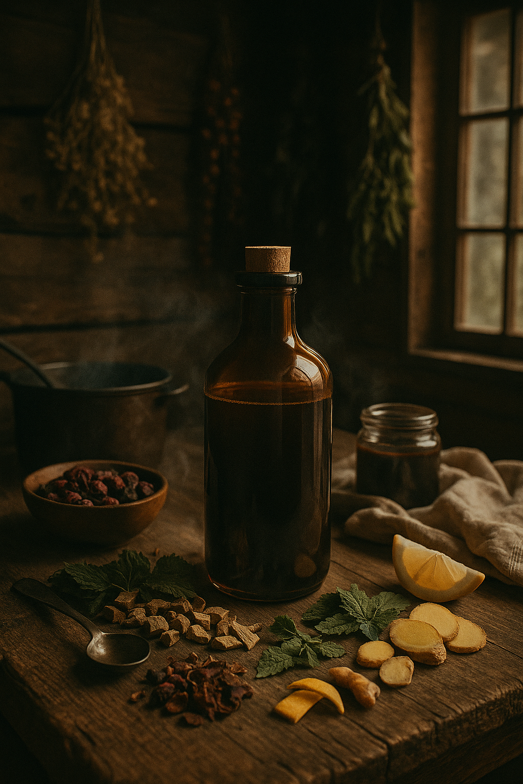 Strain through fine sieve/cheesecloth; press herbs. If >700 ml, simmer gently to ~500 ml.🧪 Finish the syrup (no boil):